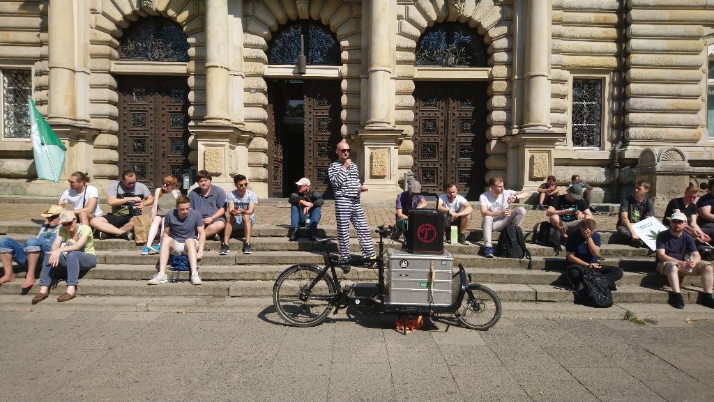 Unser Sprecher Marc Schlosser zeigt bei seiner Rede vor dem Hamburger Strafjustizgebäude auf wie weltweit umgedacht wird. Teile der USA, Kanada, Uruguay und sogar Luxemburg legalisieren Hanf. Nur Deutschland werde immer restriktiver.